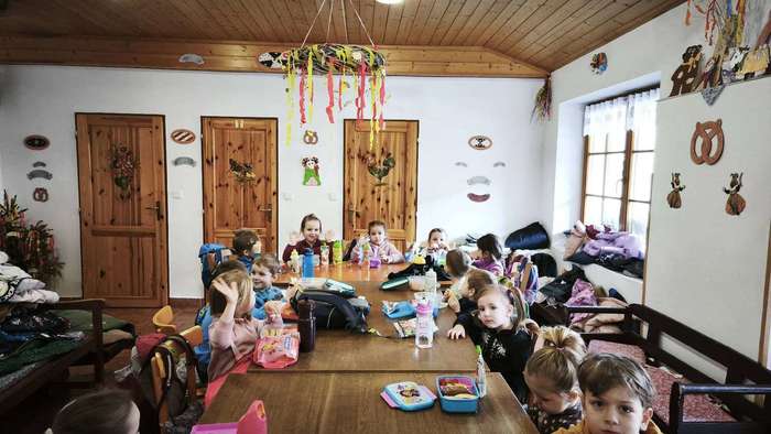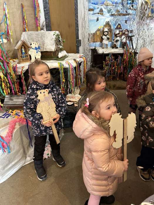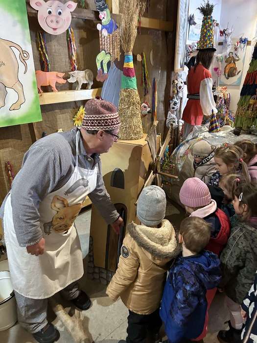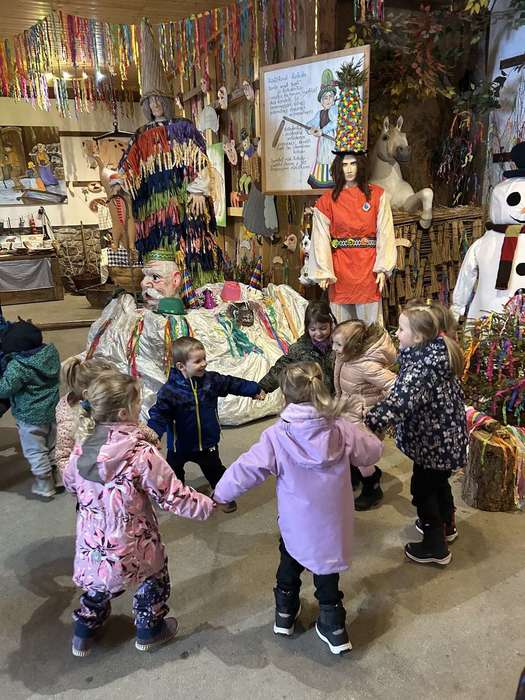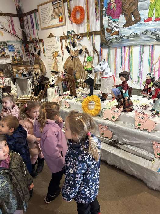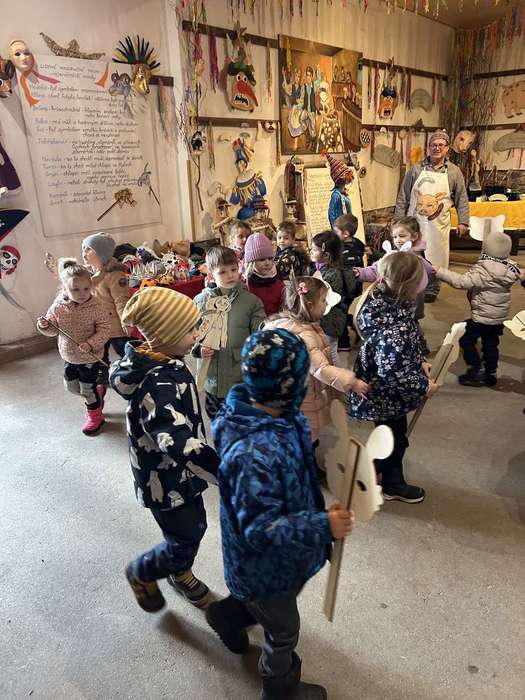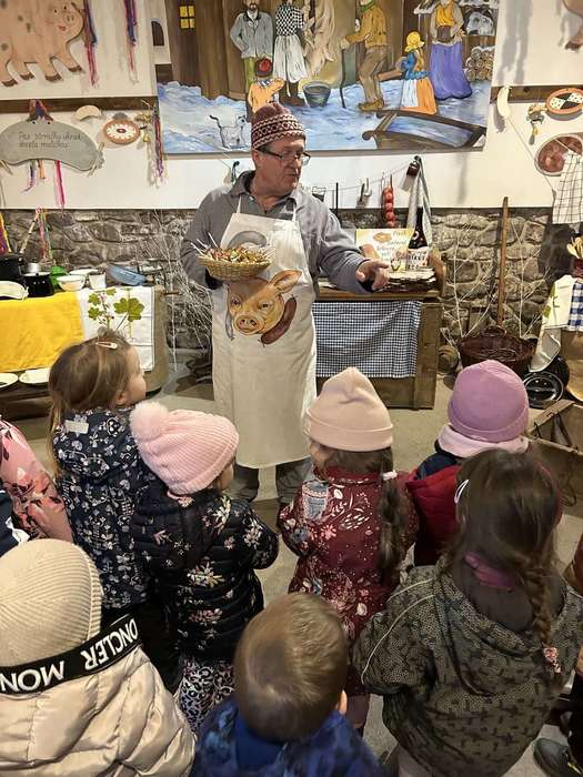 ???? Celým programem nás provedl pan řezník a vyprávěl nám o této oblíbené české tradici. Zkoukli jsme i zabijačku, vyzkoušeli masopustní průvod, zatancovali si a namalovali malou dřevěnou maškaru.