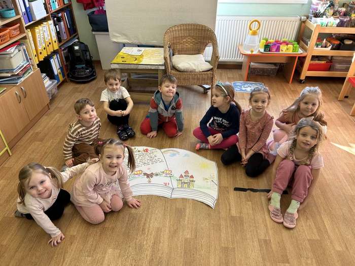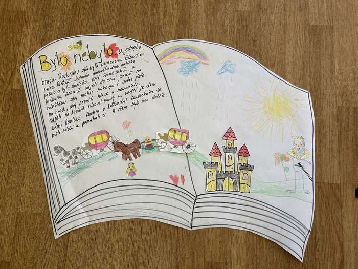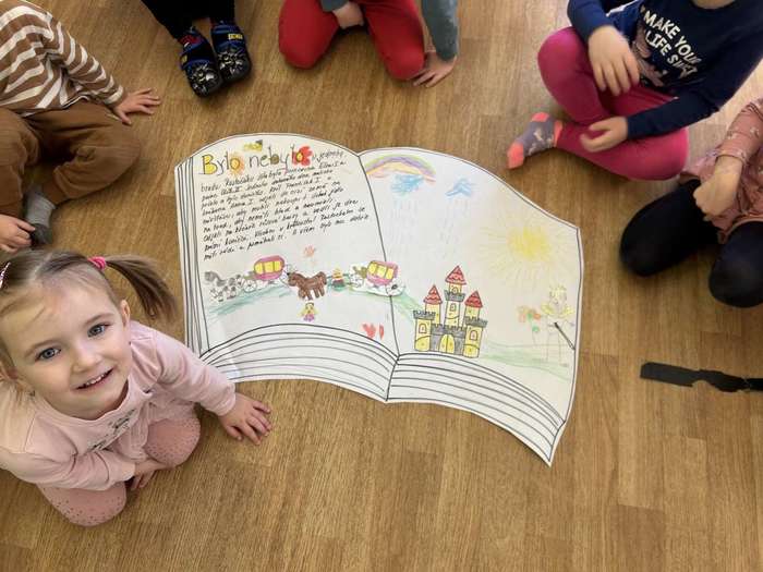 Závěr měsíce patřil pohádkám a kouzelným příběhům. Nezůstali jsme ale jen u čtení ..... Velkou pohádkovou knížku jsme si totiž dokonce i vytvořili. Nejdříve si děti zkusily práci ilustrátorů. Fantazii se meze nekladly a podle obrázků děti dotvořily vlastní pohádkový příběh.