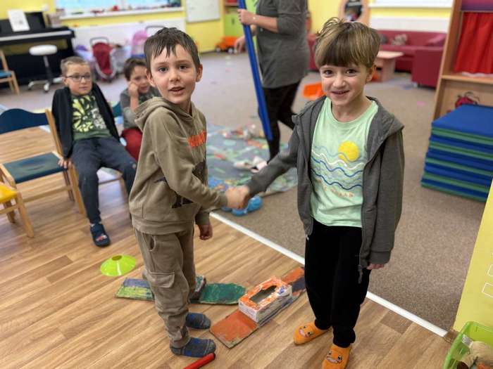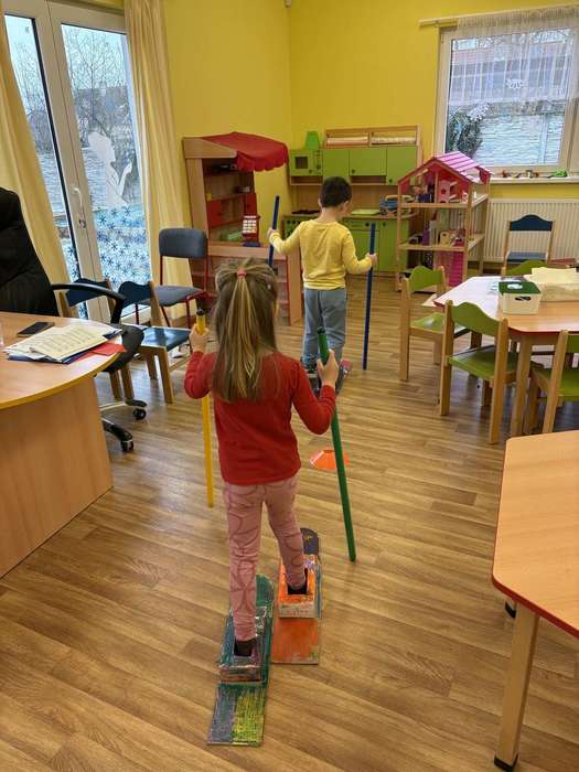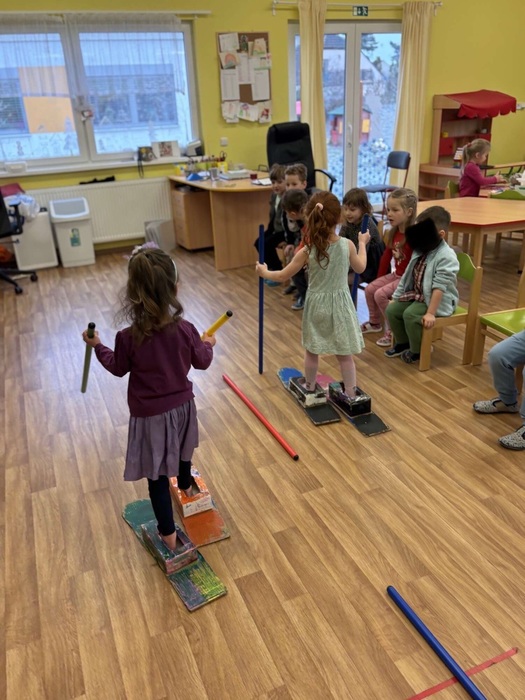Na začátku měsíce jsme navázali na téma zimních sportů. Povídali jsme si o zimní olympiádě a některé sporty jsme zkusili napodobit při pohybových hrách, například při lyžařských závodech na společně vyrobených lyžích. Společně jsme si připomněli, že při sportování je důležitá nejen snaha vyhrát, ale také fair play a radost z pohybu.